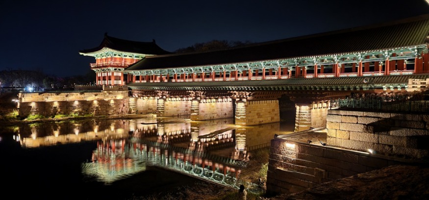 조선 시대 교각을 재현한 목조 다리와 고풍스러운 조명은 밤에 더욱 환상적입니다.